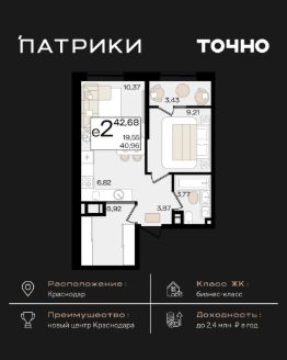 Продаётся 2-комнатная квартира в строящемся доме (Литер 1.3), срок сдачи: IV-кв. 2025, общей площадью 40.96 кв.м., на 13 этаже. Флагманский проект группы компаний Точно - жилой комплекс бизнес-класса Патрики, это 10 домов разной этажности расположившихся на 28,5 гектарах. Жилой комплекс с концепцией город в город - прогулочные аллеи, парковая территория, 3 детских сада, 2 школы - одна из которых частная, Гранд аллея с ресторанами, фонтанами и модными бутиками, уникальные мафы и ландшафтный дизайн, создают особую атмосферу - место в котором хочется находиться. В Патриках предусмотрен и креативный кластер Цех, который включает в себя пространство для коворкинга, фудкорт, бутики, детский комплекс, лектории, фитнес-клуб Баланс с волной для сёрфа. Но и это еще не все ГК Точно уважает историю, поэтому мы сохранили 2 башни - наследство от завода "Сельмаш" исторический арт-объект назвали Мастер и Маргарита.