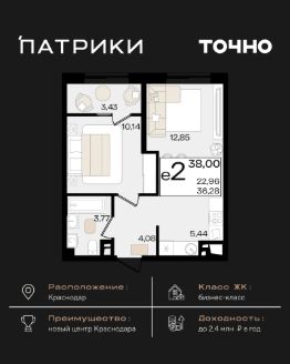 Продаётся 2-комнатная квартира в строящемся доме (Литер 1.3), срок сдачи: IV-кв. 2025, общей площадью 36.28 кв.м., на 2 этаже. Флагманский проект группы компаний Точно - жилой комплекс бизнес-класса Патрики, это 10 домов разной этажности расположившихся на 28,5 гектарах. Жилой комплекс с концепцией город в город - прогулочные аллеи, парковая территория, 3 детских сада, 2 школы - одна из которых частная, Гранд аллея с ресторанами, фонтанами и модными бутиками, уникальные мафы и ландшафтный дизайн, создают особую атмосферу - место в котором хочется находиться. В Патриках предусмотрен и креативный кластер Цех, который включает в себя пространство для коворкинга, фудкорт, бутики, детский комплекс, лектории, фитнес-клуб Баланс с волной для сёрфа. Но и это еще не все ГК Точно уважает историю, поэтому мы сохранили 2 башни - наследство от завода "Сельмаш" исторический арт-объект назвали Мастер и Маргарита.