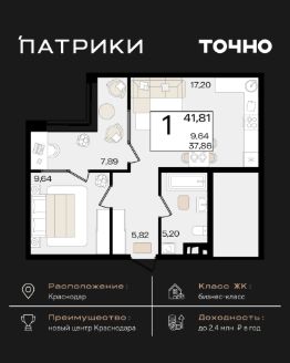 Продаётся 1-комнатная квартира в строящемся доме (Литер 1.3), срок сдачи: IV-кв. 2025, общей площадью 37.86 кв.м., на 3 этаже. Флагманский проект группы компаний Точно - жилой комплекс бизнес-класса Патрики, это 10 домов разной этажности расположившихся на 28,5 гектарах. Жилой комплекс с концепцией город в город - прогулочные аллеи, парковая территория, 3 детских сада, 2 школы - одна из которых частная, Гранд аллея с ресторанами, фонтанами и модными бутиками, уникальные мафы и ландшафтный дизайн, создают особую атмосферу - место в котором хочется находиться. В Патриках предусмотрен и креативный кластер Цех, который включает в себя пространство для коворкинга, фудкорт, бутики, детский комплекс, лектории, фитнес-клуб Баланс с волной для сёрфа. Но и это еще не все ГК Точно уважает историю, поэтому мы сохранили 2 башни - наследство от завода "Сельмаш" исторический арт-объект назвали Мастер и Маргарита.