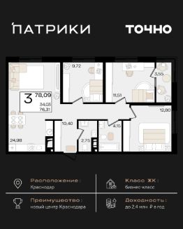 Продаётся 3-комнатная квартира в строящемся доме (Литер 1.3), срок сдачи: IV-кв. 2025, общей площадью 76.31 кв.м., на 2 этаже. Флагманский проект группы компаний Точно - жилой комплекс бизнес-класса Патрики, это 10 домов разной этажности расположившихся на 28,5 гектарах. Жилой комплекс с концепцией город в город - прогулочные аллеи, парковая территория, 3 детских сада, 2 школы - одна из которых частная, Гранд аллея с ресторанами, фонтанами и модными бутиками, уникальные мафы и ландшафтный дизайн, создают особую атмосферу - место в котором хочется находиться. В Патриках предусмотрен и креативный кластер Цех, который включает в себя пространство для коворкинга, фудкорт, бутики, детский комплекс, лектории, фитнес-клуб Баланс с волной для сёрфа. Но и это еще не все ГК Точно уважает историю, поэтому мы сохранили 2 башни - наследство от завода "Сельмаш" исторический арт-объект назвали Мастер и Маргарита.