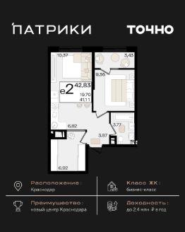 Продаётся 2-комнатная квартира в строящемся доме (Литер 1.3), срок сдачи: IV-кв. 2025, общей площадью 41.11 кв.м., на 3 этаже. Флагманский проект группы компаний Точно - жилой комплекс бизнес-класса Патрики, это 10 домов разной этажности расположившихся на 28,5 гектарах. Жилой комплекс с концепцией город в город - прогулочные аллеи, парковая территория, 3 детских сада, 2 школы - одна из которых частная, Гранд аллея с ресторанами, фонтанами и модными бутиками, уникальные мафы и ландшафтный дизайн, создают особую атмосферу - место в котором хочется находиться. В Патриках предусмотрен и креативный кластер Цех, который включает в себя пространство для коворкинга, фудкорт, бутики, детский комплекс, лектории, фитнес-клуб Баланс с волной для сёрфа. Но и это еще не все ГК Точно уважает историю, поэтому мы сохранили 2 башни - наследство от завода "Сельмаш" исторический арт-объект назвали Мастер и Маргарита.