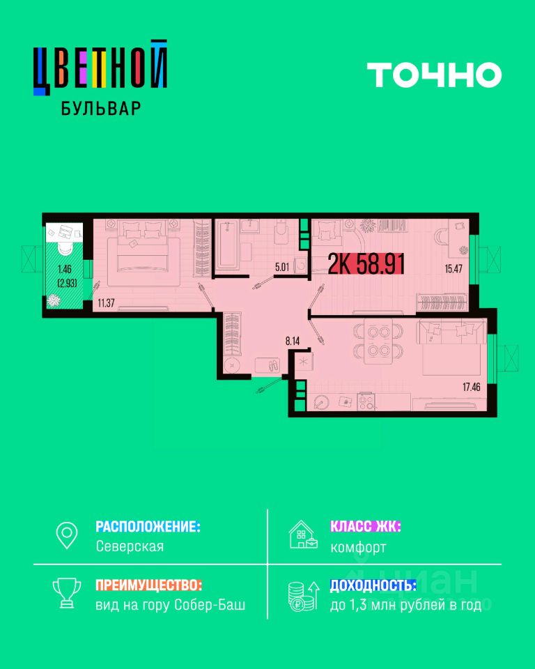 Жилой комплекс "Цветной бульвар" — это уютные дома высотой от 5 до 8 этажей, где каждый найдет квартиру своей мечты: от стильных студий до роскошных двухуровневых квартир с потрясающим видом на гору Собер-Баш! Представьте себе жизнь среди живописной природы, наслаждаясь прогулками по широкому зеленому бульвару длиной 460 метров, окруженному красивыми зелеными насаждениями и зонами для занятий спортом и отдыха всей семьей. Для детей современный детский сад и школа, где специально созданный музей и уникальная STEAM-лаборатория откроют перед ними удивительный мир науки и творчества!