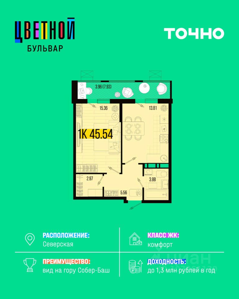 Жилой комплекс "Цветной бульвар" — это уютные дома высотой от 5 до 8 этажей, где каждый найдет квартиру своей мечты: от стильных студий до роскошных двухуровневых квартир с потрясающим видом на гору Собер-Баш! Представьте себе жизнь среди живописной природы, наслаждаясь прогулками по широкому зеленому бульвару длиной 460 метров, окруженному красивыми зелеными насаждениями и зонами для занятий спортом и отдыха всей семьей. Для детей современный детский сад и школа, где специально созданный музей и уникальная STEAM-лаборатория откроют перед ними удивительный мир науки и творчества!