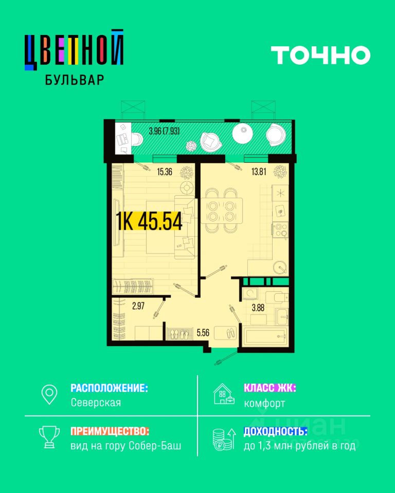 "ЖК "Цветной бульвар" — расположен в живописной станице Северская Краснодарского края и занимает территорию более 24 гектаров. Это семь кварталов комфортной среднеэтажной застройки (58 этажей), где каждый найдёт идеальную квартиру: от уютных студий до просторных двухуровневых апартаментов с террасами и видом на гору Собер-Баш. Главное пространство комплекса — зеленый бульвар длиной 460 метров с прогулочными аллеями, фонтаном, зонами отдыха и спортивными площадками. Здесь приятно гулять всей семьёй и проводить время на свежем воздухе. На территории предусмотрены современные детские площадки с безопасным покрытием, воркаут-зоны, трёхуровневое ландшафтное озеленение с газонами и кустарниками, уютные дворы без машин, более 5 000 м² коммерческой инфраструктуры, а также детский сад на 350 мест и новая школа с музеем и STEAM-лабораторией. "Цветной бульвар" — это новый уровень комфорта, где природа и современная архитектура создают пространство для счастливой жизни."