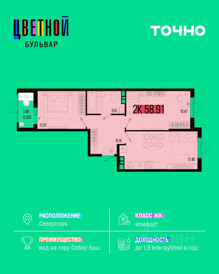 "ЖК "Цветной бульвар" — расположен в живописной станице Северская Краснодарского края и занимает территорию более 24 гектаров. Это семь кварталов комфортной среднеэтажной застройки (58 этажей), где каждый найдёт идеальную квартиру: от уютных студий до просторных двухуровневых апартаментов с террасами и видом на гору Собер-Баш. Главное пространство комплекса — зеленый бульвар длиной 460 метров с прогулочными аллеями, фонтаном, зонами отдыха и спортивными площадками. Здесь приятно гулять всей семьёй и проводить время на свежем воздухе. На территории предусмотрены современные детские площадки с безопасным покрытием, воркаут-зоны, трёхуровневое ландшафтное озеленение с газонами и кустарниками, уютные дворы без машин, более 5 000 м² коммерческой инфраструктуры, а также детский сад на 350 мест и новая школа с музеем и STEAM-лабораторией. "Цветной бульвар" — это новый уровень комфорта, где природа и современная архитектура создают пространство для счастливой жизни."
