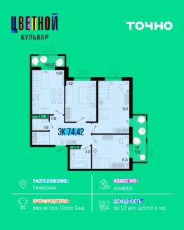 "ЖК "Цветной бульвар" — расположен в живописной станице Северская Краснодарского края и занимает территорию более 24 гектаров. Это семь кварталов комфортной среднеэтажной застройки (58 этажей), где каждый найдёт идеальную квартиру: от уютных студий до просторных двухуровневых апартаментов с террасами и видом на гору Собер-Баш. Главное пространство комплекса — зеленый бульвар длиной 460 метров с прогулочными аллеями, фонтаном, зонами отдыха и спортивными площадками. Здесь приятно гулять всей семьёй и проводить время на свежем воздухе. На территории предусмотрены современные детские площадки с безопасным покрытием, воркаут-зоны, трёхуровневое ландшафтное озеленение с газонами и кустарниками, уютные дворы без машин, более 5 000 м² коммерческой инфраструктуры, а также детский сад на 350 мест и новая школа с музеем и STEAM-лабораторией. "Цветной бульвар" — это новый уровень комфорта, где природа и современная архитектура создают пространство для счастливой жизни."