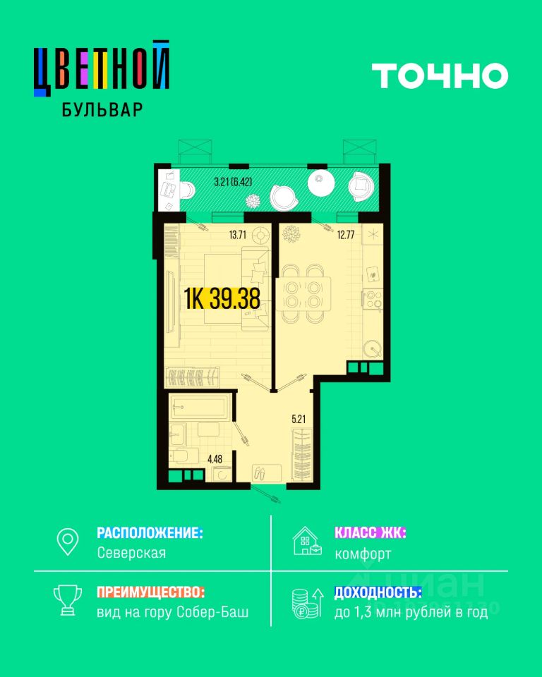 "ЖК "Цветной бульвар" — расположен в живописной станице Северская Краснодарского края и занимает территорию более 24 гектаров. Это семь кварталов комфортной среднеэтажной застройки (58 этажей), где каждый найдёт идеальную квартиру: от уютных студий до просторных двухуровневых апартаментов с террасами и видом на гору Собер-Баш. Главное пространство комплекса — зеленый бульвар длиной 460 метров с прогулочными аллеями, фонтаном, зонами отдыха и спортивными площадками. Здесь приятно гулять всей семьёй и проводить время на свежем воздухе. На территории предусмотрены современные детские площадки с безопасным покрытием, воркаут-зоны, трёхуровневое ландшафтное озеленение с газонами и кустарниками, уютные дворы без машин, более 5 000 м² коммерческой инфраструктуры, а также детский сад на 350 мест и новая школа с музеем и STEAM-лабораторией. "Цветной бульвар" — это новый уровень комфорта, где природа и современная архитектура создают пространство для счастливой жизни."