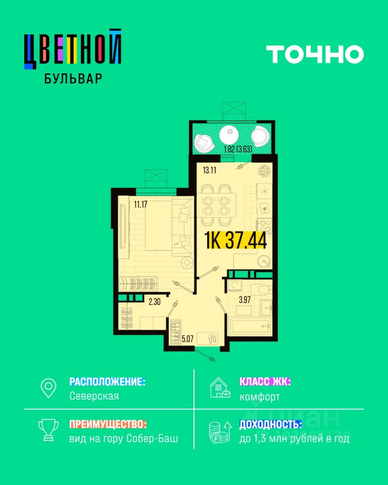 "ЖК "Цветной бульвар" — расположен в живописной станице Северская Краснодарского края и занимает территорию более 24 гектаров. Это семь кварталов комфортной среднеэтажной застройки (58 этажей), где каждый найдёт идеальную квартиру: от уютных студий до просторных двухуровневых апартаментов с террасами и видом на гору Собер-Баш. Главное пространство комплекса — зеленый бульвар длиной 460 метров с прогулочными аллеями, фонтаном, зонами отдыха и спортивными площадками. Здесь приятно гулять всей семьёй и проводить время на свежем воздухе. На территории предусмотрены современные детские площадки с безопасным покрытием, воркаут-зоны, трёхуровневое ландшафтное озеленение с газонами и кустарниками, уютные дворы без машин, более 5 000 м² коммерческой инфраструктуры, а также детский сад на 350 мест и новая школа с музеем и STEAM-лабораторией. "Цветной бульвар" — это новый уровень комфорта, где природа и современная архитектура создают пространство для счастливой жизни."