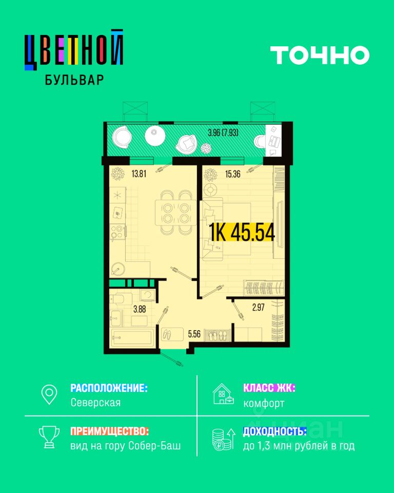 "ЖК "Цветной бульвар" — расположен в живописной станице Северская Краснодарского края и занимает территорию более 24 гектаров. Это семь кварталов комфортной среднеэтажной застройки (58 этажей), где каждый найдёт идеальную квартиру: от уютных студий до просторных двухуровневых апартаментов с террасами и видом на гору Собер-Баш. Главное пространство комплекса — зеленый бульвар длиной 460 метров с прогулочными аллеями, фонтаном, зонами отдыха и спортивными площадками. Здесь приятно гулять всей семьёй и проводить время на свежем воздухе. На территории предусмотрены современные детские площадки с безопасным покрытием, воркаут-зоны, трёхуровневое ландшафтное озеленение с газонами и кустарниками, уютные дворы без машин, более 5 000 м² коммерческой инфраструктуры, а также детский сад на 350 мест и новая школа с музеем и STEAM-лабораторией. "Цветной бульвар" — это новый уровень комфорта, где природа и современная архитектура создают пространство для счастливой жизни."