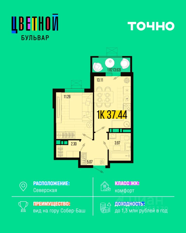 "ЖК "Цветной бульвар" — расположен в живописной станице Северская Краснодарского края и занимает территорию более 24 гектаров. Это семь кварталов комфортной среднеэтажной застройки (58 этажей), где каждый найдёт идеальную квартиру: от уютных студий до просторных двухуровневых апартаментов с террасами и видом на гору Собер-Баш. Главное пространство комплекса — зеленый бульвар длиной 460 метров с прогулочными аллеями, фонтаном, зонами отдыха и спортивными площадками. Здесь приятно гулять всей семьёй и проводить время на свежем воздухе. На территории предусмотрены современные детские площадки с безопасным покрытием, воркаут-зоны, трёхуровневое ландшафтное озеленение с газонами и кустарниками, уютные дворы без машин, более 5 000 м² коммерческой инфраструктуры, а также детский сад на 350 мест и новая школа с музеем и STEAM-лабораторией. "Цветной бульвар" — это новый уровень комфорта, где природа и современная архитектура создают пространство для счастливой жизни."