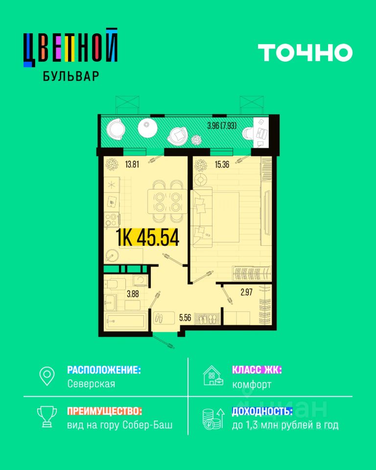 "ЖК "Цветной бульвар" — расположен в живописной станице Северская Краснодарского края и занимает территорию более 24 гектаров. Это семь кварталов комфортной среднеэтажной застройки (58 этажей), где каждый найдёт идеальную квартиру: от уютных студий до просторных двухуровневых апартаментов с террасами и видом на гору Собер-Баш. Главное пространство комплекса — зеленый бульвар длиной 460 метров с прогулочными аллеями, фонтаном, зонами отдыха и спортивными площадками. Здесь приятно гулять всей семьёй и проводить время на свежем воздухе. На территории предусмотрены современные детские площадки с безопасным покрытием, воркаут-зоны, трёхуровневое ландшафтное озеленение с газонами и кустарниками, уютные дворы без машин, более 5 000 м² коммерческой инфраструктуры, а также детский сад на 350 мест и новая школа с музеем и STEAM-лабораторией. "Цветной бульвар" — это новый уровень комфорта, где природа и современная архитектура создают пространство для счастливой жизни."