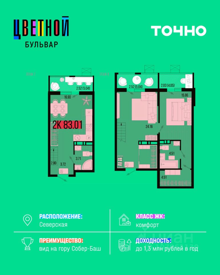 Жилой комплекс "Цветной бульвар" — это уютные дома высотой от 5 до 8 этажей, где каждый найдет квартиру своей мечты: от стильных студий до роскошных двухуровневых квартир с потрясающим видом на гору Собер-Баш! Представьте себе жизнь среди живописной природы, наслаждаясь прогулками по широкому зеленому бульвару длиной 460 метров, окруженному красивыми зелеными насаждениями и зонами для занятий спортом и отдыха всей семьей. Для детей современный детский сад и школа, где специально созданный музей и уникальная STEAM-лаборатория откроют перед ними удивительный мир науки и творчества!