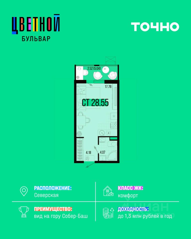 Жилой комплекс "Цветной бульвар" — это уютные дома высотой от 5 до 8 этажей, где каждый найдет квартиру своей мечты: от стильных студий до роскошных двухуровневых квартир с потрясающим видом на гору Собер-Баш! Представьте себе жизнь среди живописной природы, наслаждаясь прогулками по широкому зеленому бульвару длиной 460 метров, окруженному красивыми зелеными насаждениями и зонами для занятий спортом и отдыха всей семьей. Для детей современный детский сад и школа, где специально созданный музей и уникальная STEAM-лаборатория откроют перед ними удивительный мир науки и творчества!