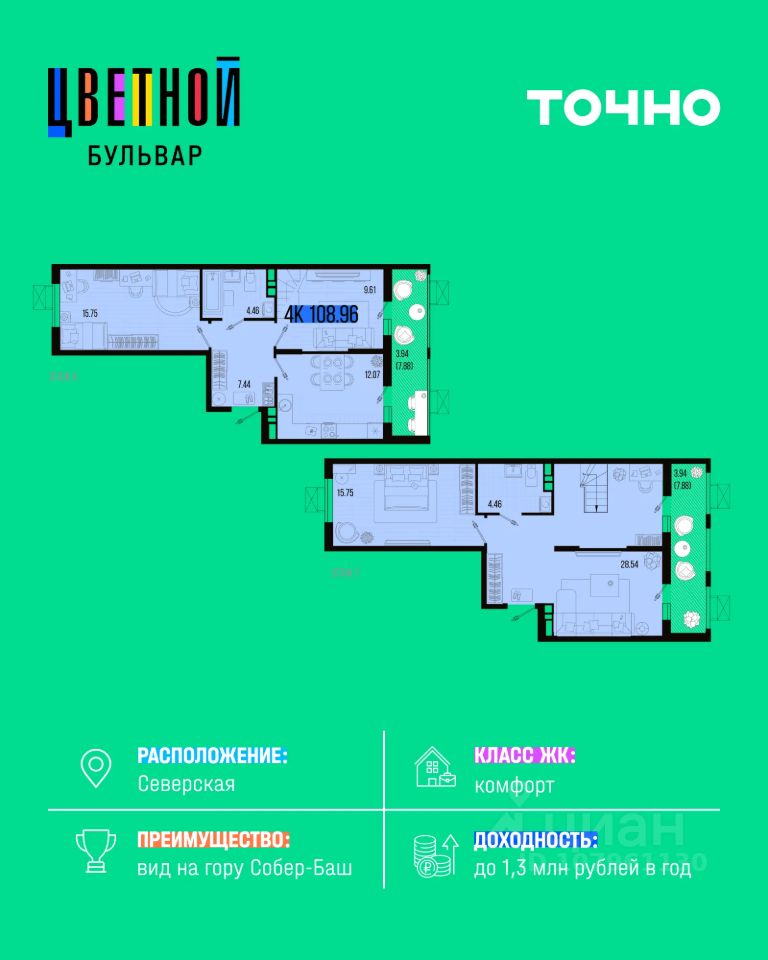 "ЖК "Цветной бульвар" — расположен в живописной станице Северская Краснодарского края и занимает территорию более 24 гектаров. Это семь кварталов комфортной среднеэтажной застройки (58 этажей), где каждый найдёт идеальную квартиру: от уютных студий до просторных двухуровневых апартаментов с террасами и видом на гору Собер-Баш. Главное пространство комплекса — зеленый бульвар длиной 460 метров с прогулочными аллеями, фонтаном, зонами отдыха и спортивными площадками. Здесь приятно гулять всей семьёй и проводить время на свежем воздухе. На территории предусмотрены современные детские площадки с безопасным покрытием, воркаут-зоны, трёхуровневое ландшафтное озеленение с газонами и кустарниками, уютные дворы без машин, более 5 000 м² коммерческой инфраструктуры, а также детский сад на 350 мест и новая школа с музеем и STEAM-лабораторией. "Цветной бульвар" — это новый уровень комфорта, где природа и современная архитектура создают пространство для счастливой жизни."