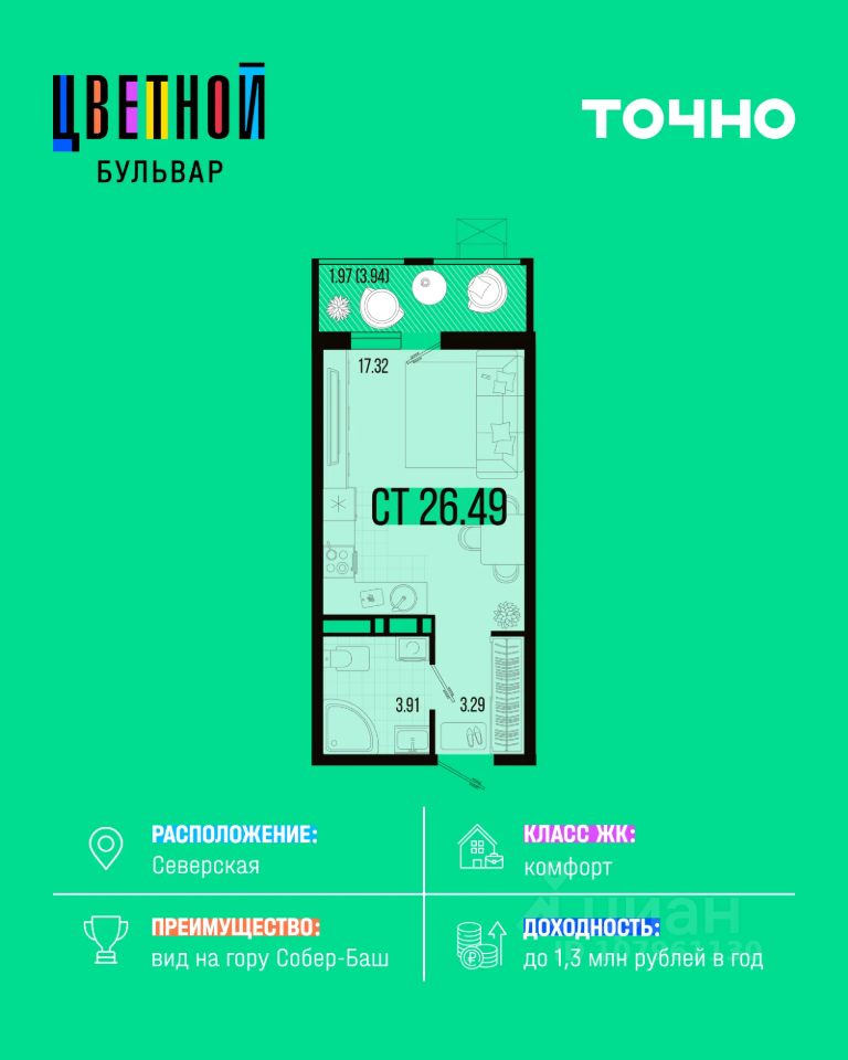"ЖК "Цветной бульвар" — расположен в живописной станице Северская Краснодарского края и занимает территорию более 24 гектаров. Это семь кварталов комфортной среднеэтажной застройки (58 этажей), где каждый найдёт идеальную квартиру: от уютных студий до просторных двухуровневых апартаментов с террасами и видом на гору Собер-Баш. Главное пространство комплекса — зеленый бульвар длиной 460 метров с прогулочными аллеями, фонтаном, зонами отдыха и спортивными площадками. Здесь приятно гулять всей семьёй и проводить время на свежем воздухе. На территории предусмотрены современные детские площадки с безопасным покрытием, воркаут-зоны, трёхуровневое ландшафтное озеленение с газонами и кустарниками, уютные дворы без машин, более 5 000 м² коммерческой инфраструктуры, а также детский сад на 350 мест и новая школа с музеем и STEAM-лабораторией. "Цветной бульвар" — это новый уровень комфорта, где природа и современная архитектура создают пространство для счастливой жизни."