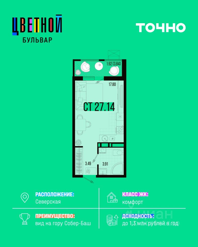"ЖК "Цветной бульвар" — расположен в живописной станице Северская Краснодарского края и занимает территорию более 24 гектаров. Это семь кварталов комфортной среднеэтажной застройки (58 этажей), где каждый найдёт идеальную квартиру: от уютных студий до просторных двухуровневых апартаментов с террасами и видом на гору Собер-Баш. Главное пространство комплекса — зеленый бульвар длиной 460 метров с прогулочными аллеями, фонтаном, зонами отдыха и спортивными площадками. Здесь приятно гулять всей семьёй и проводить время на свежем воздухе. На территории предусмотрены современные детские площадки с безопасным покрытием, воркаут-зоны, трёхуровневое ландшафтное озеленение с газонами и кустарниками, уютные дворы без машин, более 5 000 м² коммерческой инфраструктуры, а также детский сад на 350 мест и новая школа с музеем и STEAM-лабораторией. "Цветной бульвар" — это новый уровень комфорта, где природа и современная архитектура создают пространство для счастливой жизни."