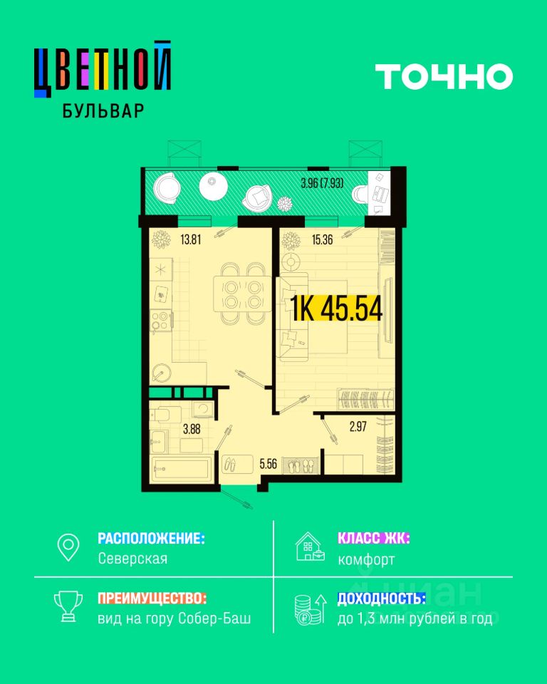 "ЖК "Цветной бульвар" — расположен в живописной станице Северская Краснодарского края и занимает территорию более 24 гектаров. Это семь кварталов комфортной среднеэтажной застройки (58 этажей), где каждый найдёт идеальную квартиру: от уютных студий до просторных двухуровневых апартаментов с террасами и видом на гору Собер-Баш. Главное пространство комплекса — зеленый бульвар длиной 460 метров с прогулочными аллеями, фонтаном, зонами отдыха и спортивными площадками. Здесь приятно гулять всей семьёй и проводить время на свежем воздухе. На территории предусмотрены современные детские площадки с безопасным покрытием, воркаут-зоны, трёхуровневое ландшафтное озеленение с газонами и кустарниками, уютные дворы без машин, более 5 000 м² коммерческой инфраструктуры, а также детский сад на 350 мест и новая школа с музеем и STEAM-лабораторией. "Цветной бульвар" — это новый уровень комфорта, где природа и современная архитектура создают пространство для счастливой жизни."