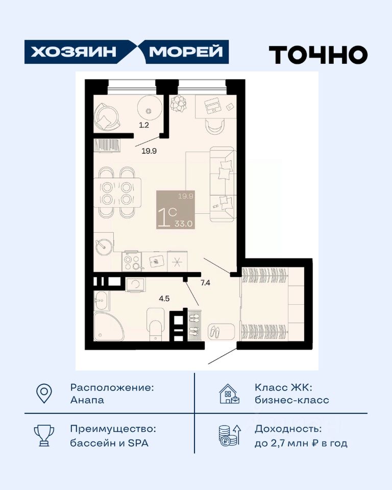 Откройте для себя мир комфорта и роскоши в жилом комплексе бизнес-класса "Хозяин морей". 9 домов от 8 до 12 этажей окружены благоустроенной территорией с прогулочными дорожками, бассейнами, детскими площадками, пространством для спорта и отдыха, двумя садиками и просторной школой. Здесь представлены разнообразные планировки: от комфортабельных студий площадью 33 кв.м до просторных семейных квартир с уникальными видами на бескрайнее море — идеальная комбинация уюта и статуса!