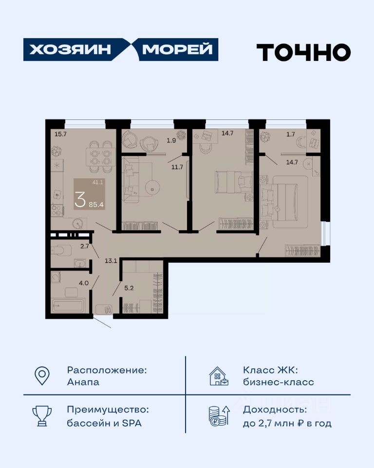 Откройте для себя мир комфорта и роскоши в жилом комплексе бизнес-класса "Хозяин морей". 9 домов от 8 до 12 этажей окружены благоустроенной территорией с прогулочными дорожками, бассейнами, детскими площадками, пространством для спорта и отдыха, двумя садиками и просторной школой. Здесь представлены разнообразные планировки: от комфортабельных студий площадью 33 кв.м до просторных семейных квартир с уникальными видами на бескрайнее море — идеальная комбинация уюта и статуса!