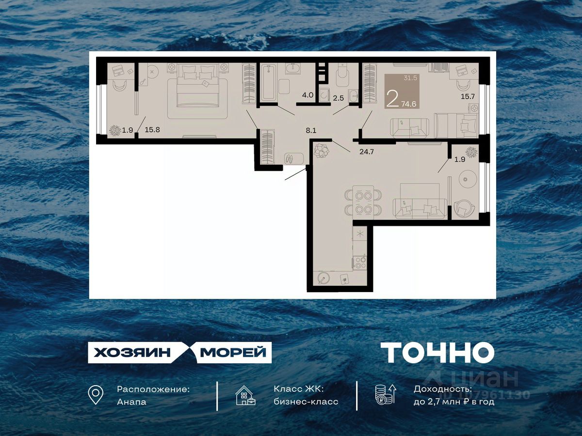 Откройте для себя мир комфорта и роскоши в жилом комплексе бизнес-класса "Хозяин морей". 9 домов от 8 до 12 этажей окружены благоустроенной территорией с прогулочными дорожками, бассейнами, детскими площадками, пространством для спорта и отдыха, двумя садиками и просторной школой. Здесь представлены разнообразные планировки: от комфортабельных студий площадью 33 кв.м до просторных семейных квартир с уникальными видами на бескрайнее море — идеальная комбинация уюта и статуса!