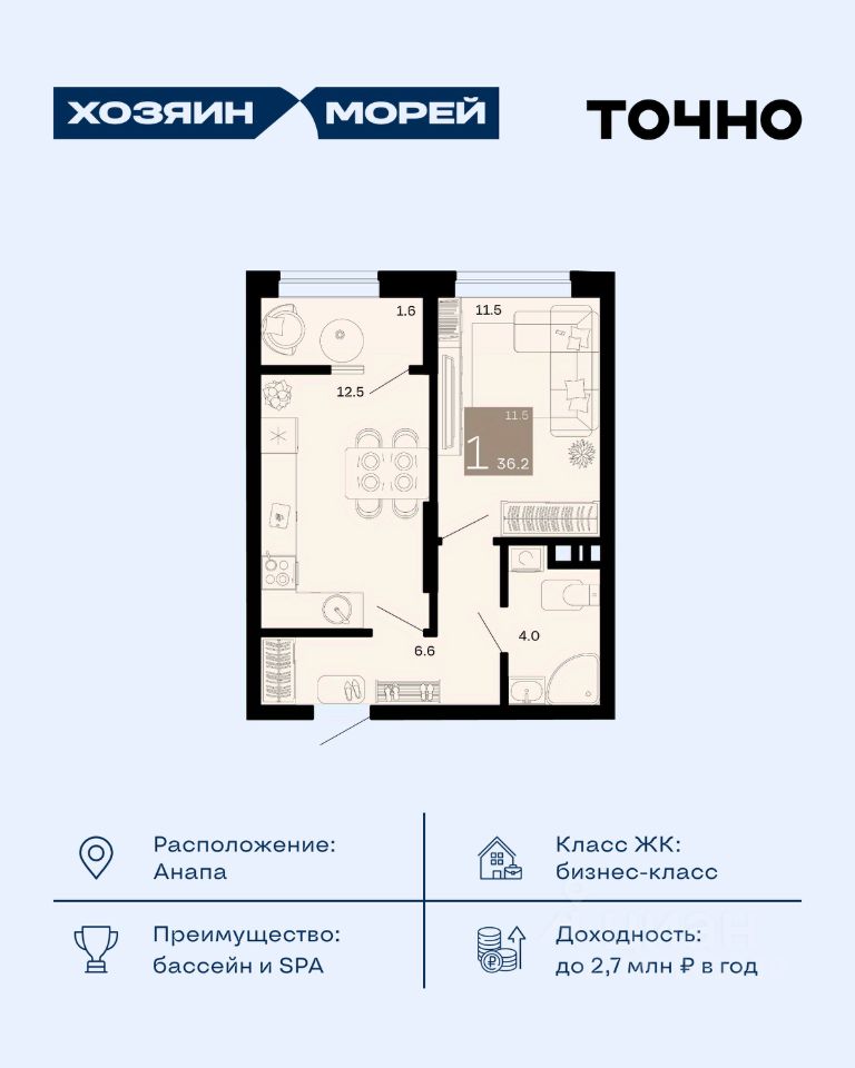 Откройте для себя мир комфорта и роскоши в жилом комплексе бизнес-класса "Хозяин морей". 9 домов от 8 до 12 этажей окружены благоустроенной территорией с прогулочными дорожками, бассейнами, детскими площадками, пространством для спорта и отдыха, двумя садиками и просторной школой. Здесь представлены разнообразные планировки: от комфортабельных студий площадью 33 кв.м до просторных семейных квартир с уникальными видами на бескрайнее море — идеальная комбинация уюта и статуса!