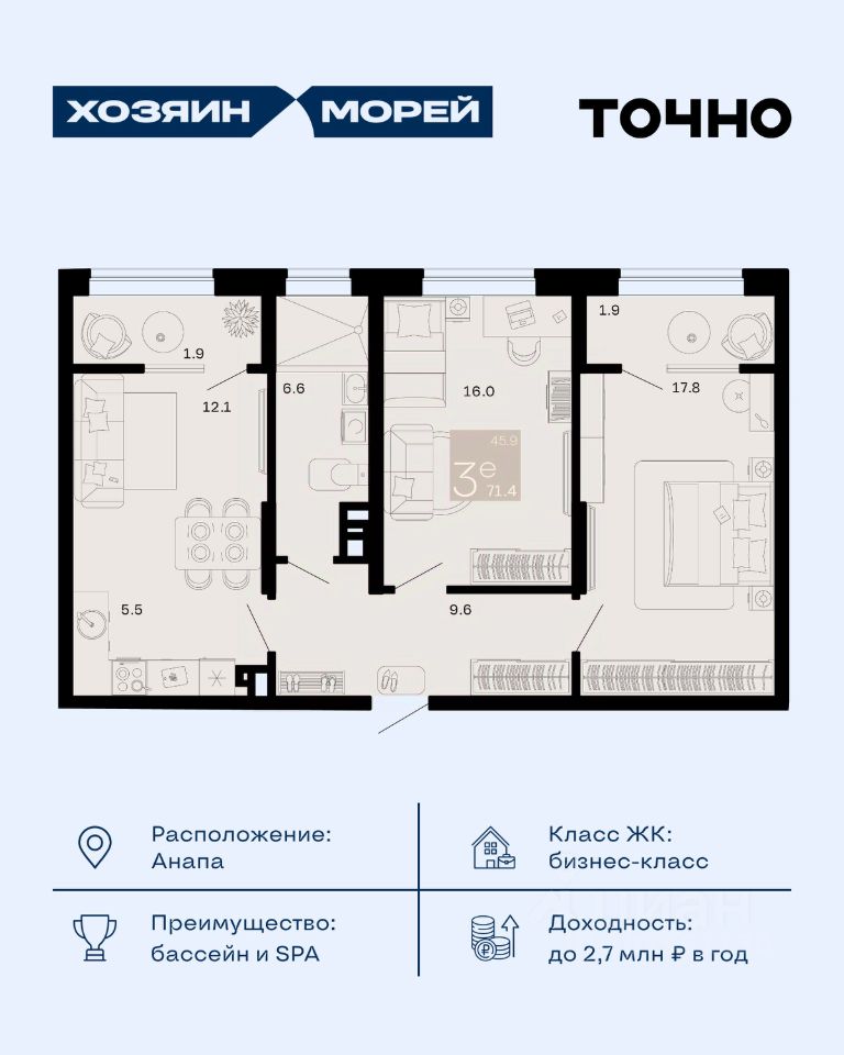 Откройте для себя мир комфорта и роскоши в жилом комплексе бизнес-класса "Хозяин морей". 9 домов от 8 до 12 этажей окружены благоустроенной территорией с прогулочными дорожками, бассейнами, детскими площадками, пространством для спорта и отдыха, двумя садиками и просторной школой. Здесь представлены разнообразные планировки: от комфортабельных студий площадью 33 кв.м до просторных семейных квартир с уникальными видами на бескрайнее море — идеальная комбинация уюта и статуса!