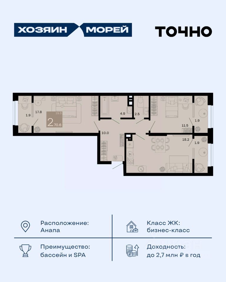 Откройте для себя мир комфорта и роскоши в жилом комплексе бизнес-класса "Хозяин морей". 9 домов от 8 до 12 этажей окружены благоустроенной территорией с прогулочными дорожками, бассейнами, детскими площадками, пространством для спорта и отдыха, двумя садиками и просторной школой. Здесь представлены разнообразные планировки: от комфортабельных студий площадью 33 кв.м до просторных семейных квартир с уникальными видами на бескрайнее море — идеальная комбинация уюта и статуса!