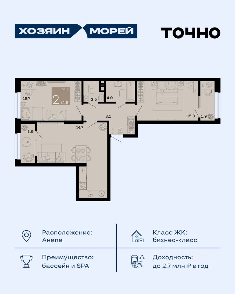 Откройте для себя мир комфорта и роскоши в жилом комплексе бизнес-класса "Хозяин морей". 9 домов от 8 до 12 этажей окружены благоустроенной территорией с прогулочными дорожками, бассейнами, детскими площадками, пространством для спорта и отдыха, двумя садиками и просторной школой. Здесь представлены разнообразные планировки: от комфортабельных студий площадью 33 кв.м до просторных семейных квартир с уникальными видами на бескрайнее море — идеальная комбинация уюта и статуса!
