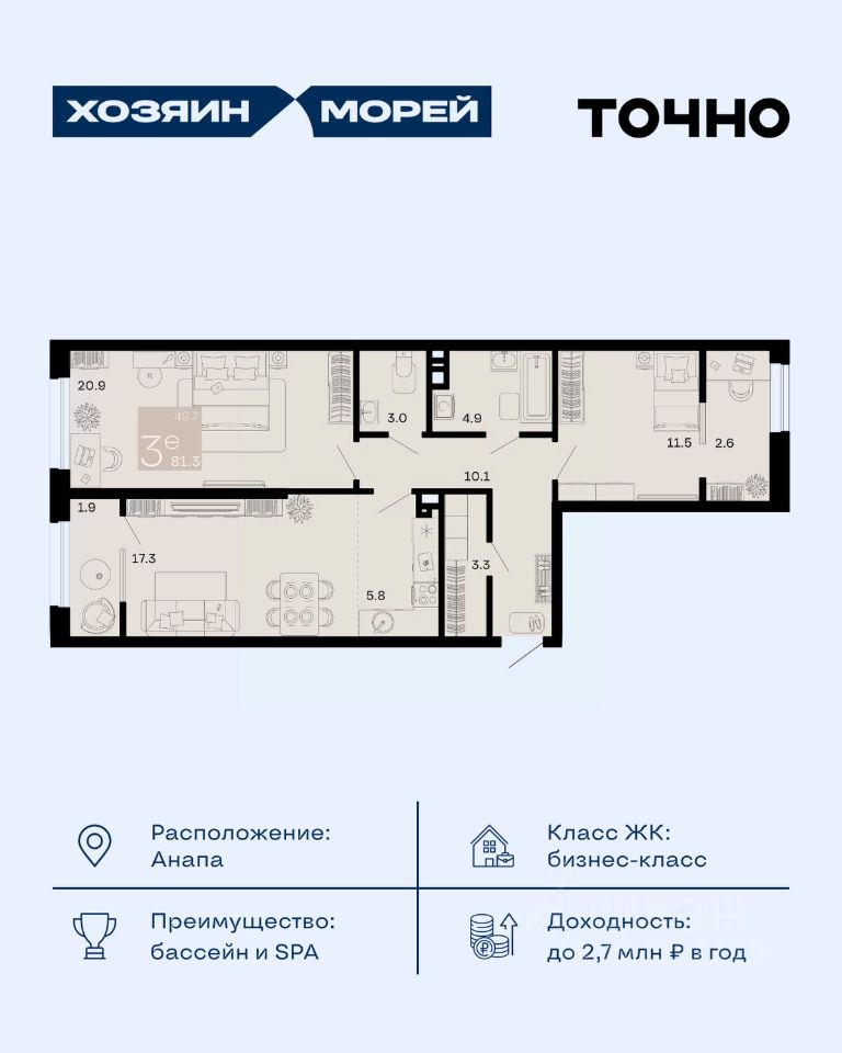 Откройте для себя мир комфорта и роскоши в жилом комплексе бизнес-класса "Хозяин морей". 9 домов от 8 до 12 этажей окружены благоустроенной территорией с прогулочными дорожками, бассейнами, детскими площадками, пространством для спорта и отдыха, двумя садиками и просторной школой. Здесь представлены разнообразные планировки: от комфортабельных студий площадью 33 кв.м до просторных семейных квартир с уникальными видами на бескрайнее море — идеальная комбинация уюта и статуса!