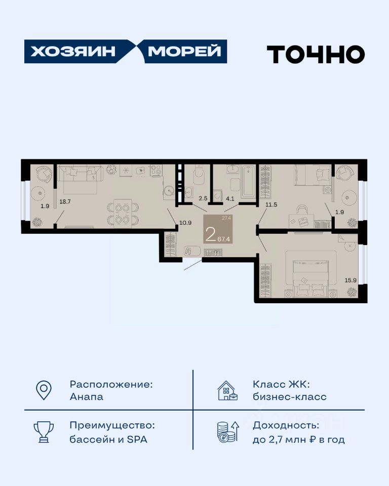 Откройте для себя мир комфорта и роскоши в жилом комплексе бизнес-класса "Хозяин морей". 9 домов от 8 до 12 этажей окружены благоустроенной территорией с прогулочными дорожками, бассейнами, детскими площадками, пространством для спорта и отдыха, двумя садиками и просторной школой. Здесь представлены разнообразные планировки: от комфортабельных студий площадью 33 кв.м до просторных семейных квартир с уникальными видами на бескрайнее море — идеальная комбинация уюта и статуса!