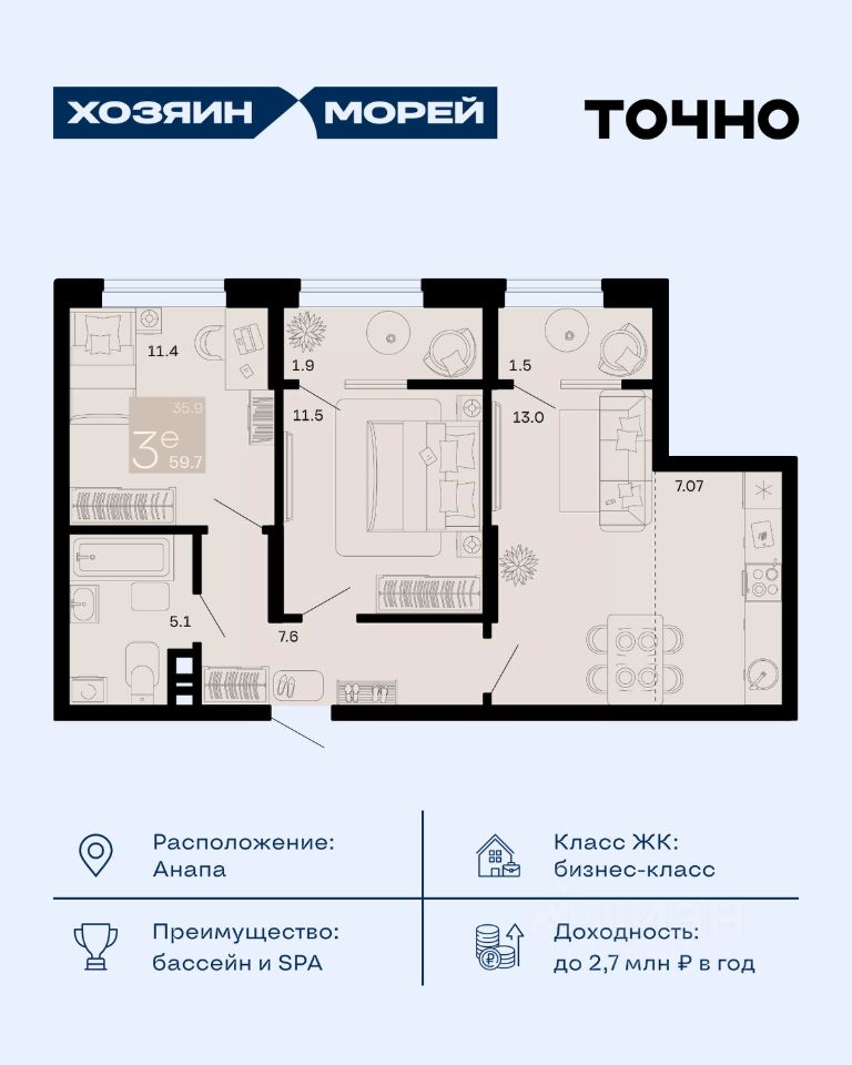 Откройте для себя мир комфорта и роскоши в жилом комплексе бизнес-класса "Хозяин морей". 9 домов от 8 до 12 этажей окружены благоустроенной территорией с прогулочными дорожками, бассейнами, детскими площадками, пространством для спорта и отдыха, двумя садиками и просторной школой. Здесь представлены разнообразные планировки: от комфортабельных студий площадью 33 кв.м до просторных семейных квартир с уникальными видами на бескрайнее море — идеальная комбинация уюта и статуса!