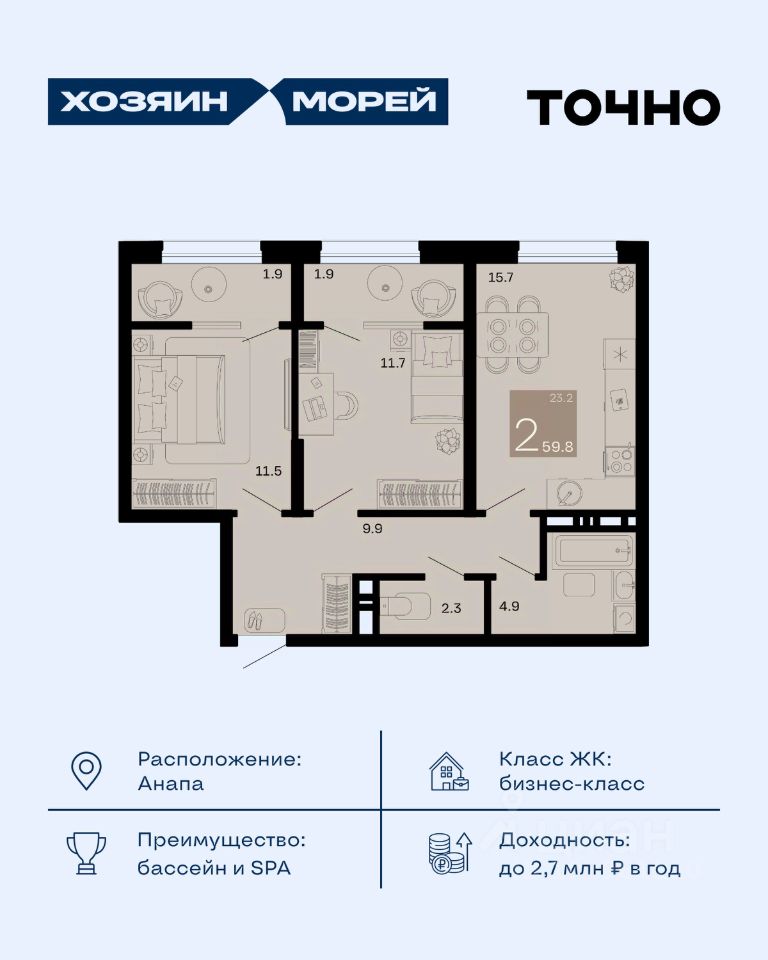 Откройте для себя мир комфорта и роскоши в жилом комплексе бизнес-класса "Хозяин морей". 9 домов от 8 до 12 этажей окружены благоустроенной территорией с прогулочными дорожками, бассейнами, детскими площадками, пространством для спорта и отдыха, двумя садиками и просторной школой. Здесь представлены разнообразные планировки: от комфортабельных студий площадью 33 кв.м до просторных семейных квартир с уникальными видами на бескрайнее море — идеальная комбинация уюта и статуса!