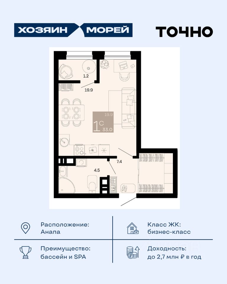 Откройте для себя мир комфорта и роскоши в жилом комплексе бизнес-класса "Хозяин морей". 9 домов от 8 до 12 этажей окружены благоустроенной территорией с прогулочными дорожками, бассейнами, детскими площадками, пространством для спорта и отдыха, двумя садиками и просторной школой. Здесь представлены разнообразные планировки: от комфортабельных студий площадью 33 кв.м до просторных семейных квартир с уникальными видами на бескрайнее море — идеальная комбинация уюта и статуса!