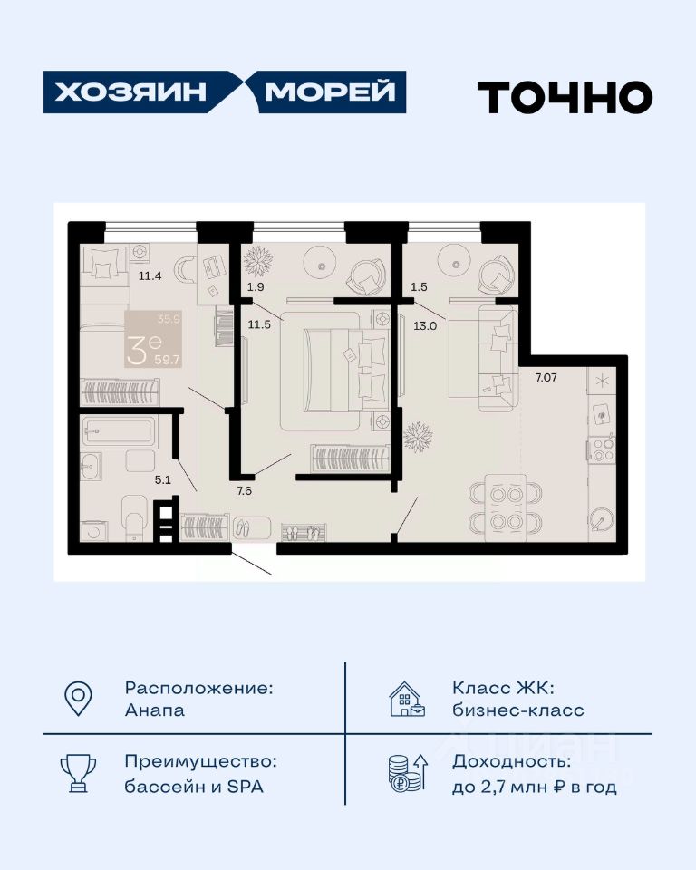 Откройте для себя мир комфорта и роскоши в жилом комплексе бизнес-класса "Хозяин морей". 9 домов от 8 до 12 этажей окружены благоустроенной территорией с прогулочными дорожками, бассейнами, детскими площадками, пространством для спорта и отдыха, двумя садиками и просторной школой. Здесь представлены разнообразные планировки: от комфортабельных студий площадью 33 кв.м до просторных семейных квартир с уникальными видами на бескрайнее море — идеальная комбинация уюта и статуса!