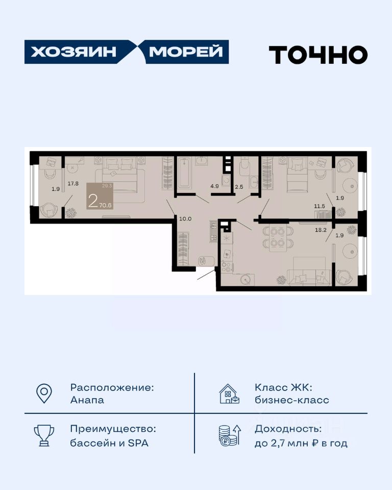 Откройте для себя мир комфорта и роскоши в жилом комплексе бизнес-класса "Хозяин морей". 9 домов от 8 до 12 этажей окружены благоустроенной территорией с прогулочными дорожками, бассейнами, детскими площадками, пространством для спорта и отдыха, двумя садиками и просторной школой. Здесь представлены разнообразные планировки: от комфортабельных студий площадью 33 кв.м до просторных семейных квартир с уникальными видами на бескрайнее море — идеальная комбинация уюта и статуса!