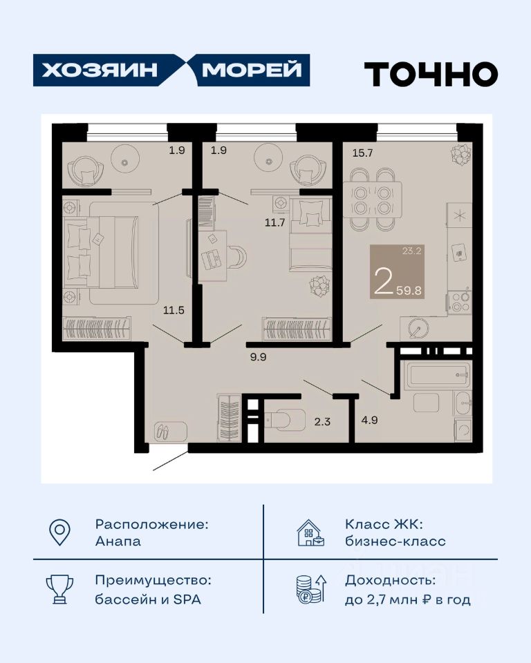 Откройте для себя мир комфорта и роскоши в жилом комплексе бизнес-класса "Хозяин морей". 9 домов от 8 до 12 этажей окружены благоустроенной территорией с прогулочными дорожками, бассейнами, детскими площадками, пространством для спорта и отдыха, двумя садиками и просторной школой. Здесь представлены разнообразные планировки: от комфортабельных студий площадью 33 кв.м до просторных семейных квартир с уникальными видами на бескрайнее море — идеальная комбинация уюта и статуса!