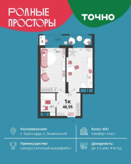 Продаётся 1-комнатная квартира в строящемся доме (Литер 12), срок сдачи: IV-кв. 2025, общей площадью 43.2 кв.м., на 17 этаже. "Родные просторы"- самодостаточный