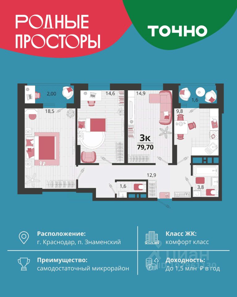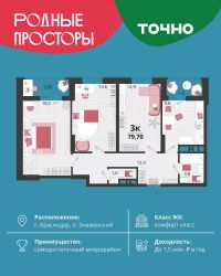 "Родные просторы"- самодостаточный микрорайон, который реализован по принципу комплексного развития территории, где есть вся инфраструктура для комфортной жизни. На территории 41 га 29 домов от 9 до 24 этажей, уютные дворы со спортивными и игровыми площадками, социальные и коммерческие объекты, зеленые массивы и фонтаны. Главная точка притяжения "Родных просторов" - парк семейного отдыха площадью 9 га, 4,5 км прогулочных аллей, амфитеатр для мероприятий, кинофестивальная площадка. Особая гордость микрорайона современная школа на 1550 мест и 3 детских сада "Ладушки", "Веснушки" и "Топотушки" на 880 малышей. В центре микрорайона строятся фитнес-клуб BALANCE с акватермальным комплексом и собственная поликлиника, площадью более 5000 кв.м. Уже открыт православный храм Святых Первоверховных апостолов Петра и Павла.