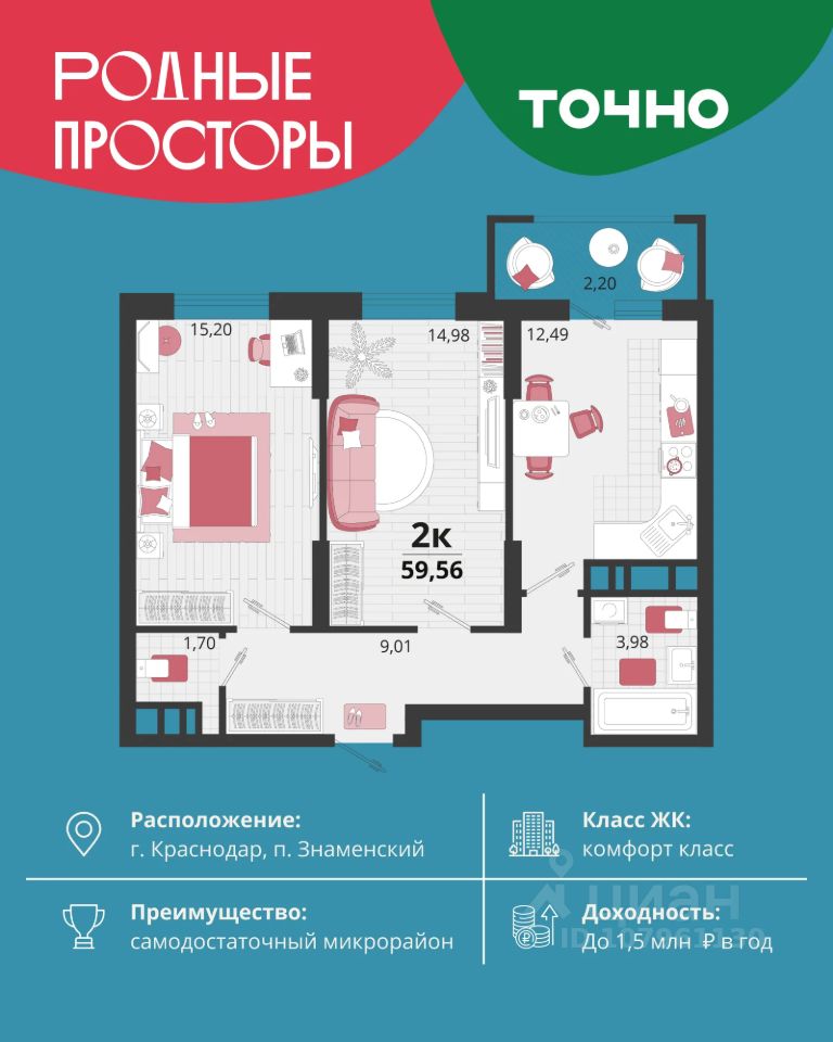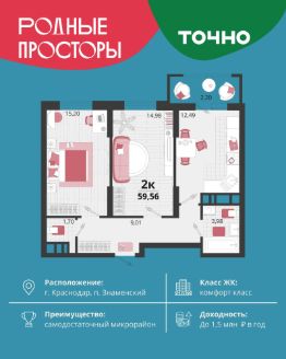 "Родные Просторы" — самодостаточный микрорайон, который реализуется по принципам комплексного развития территории. На территории 41 га возводится один из самых масштабных проектов в Краснодарском крае, который включает: 29 разновысотных домов_x000D_
