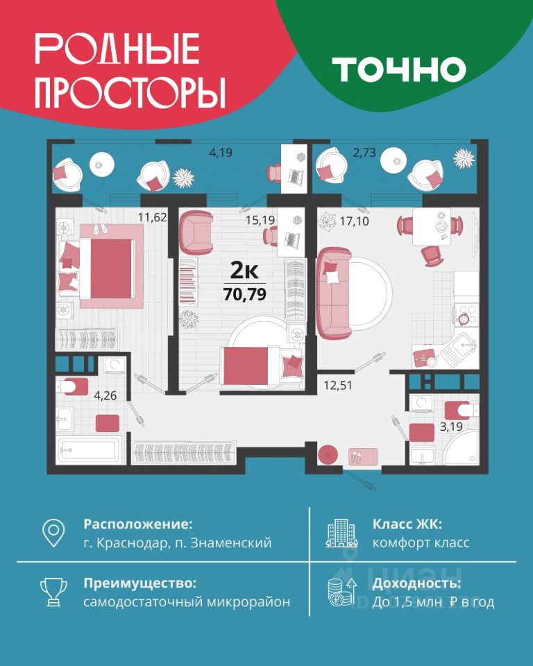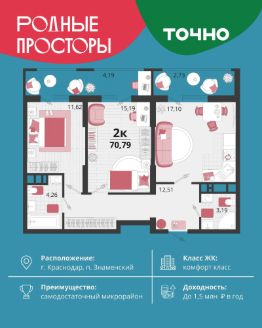 "Родные Просторы" — самодостаточный микрорайон, который реализуется по принципам комплексного развития территории. На территории 41 га возводится один из самых масштабных проектов в Краснодарском крае, который включает: 29 разновысотных домов_x000D_ от 9 до 24 этажей, уютные дворы со спортивными и игровыми площадками, социальные и коммерческие объекты, зеленые массивы и фонтаны. Главная точка притяжения "Родных Просторов" — парк семейного отдыха площадью 9 га, 4,5 км прогулочных аллей, амфитеатр для мероприятий, кинофестивальная площадка. Особая гордость микрорайона — современная школа на 1550 мест и 3 детских сада "Ладушки", "Веснушки" и "Топотушки" на 880 малышей. В центре микрорайона строятся фитнес-клуб "Баланс" с акватермальным комплексом и собственная поликлиника площадью более 5000 кв.м. Уже открыт православный храм Святых Первоверховных апостолов Петра и Павла. "Родные Просторы""— проект для жизни или инвестиций с доходом до 1,5 млн. руб. в год.*