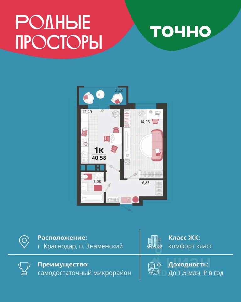 "Родные просторы"- самодостаточный микрорайон, который реализован по принципу комплексного развития территории, где есть вся инфраструктура для комфортной жизни. На территории 41 га 29 домов от 9 до 24 этажей, уютные дворы со спортивными и игровыми площадками, социальные и коммерческие объекты, зеленые массивы и фонтаны. Главная точка притяжения "Родных просторов" - парк семейного отдыха площадью 9 га, 4,5 км прогулочных аллей, амфитеатр для мероприятий, кинофестивальная площадка. Особая гордость микрорайона современная школа на 1550 мест и 3 детских сада "Ладушки", "Веснушки" и "Топотушки" на 880 малышей. В центре микрорайона строятся фитнес-клуб BALANCE с акватермальным комплексом и собственная поликлиника, площадью более 5000 кв.м. Уже открыт православный храм Святых Первоверховных апостолов Петра и Павла.