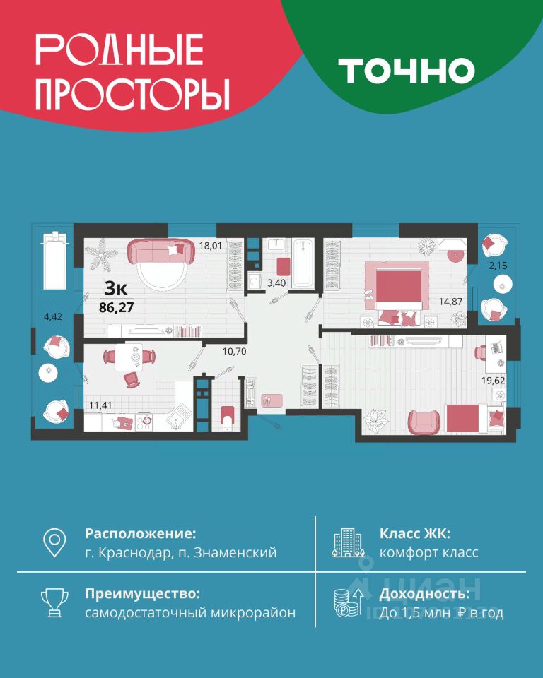 "Родные просторы"- самодостаточный микрорайон, который реализован по принципу комплексного развития территории, где есть вся инфраструктура для комфортной жизни. На территории 41 га 29 домов от 9 до 24 этажей, уютные дворы со спортивными и игровыми площадками, социальные и коммерческие объекты, зеленые массивы и фонтаны. Главная точка притяжения "Родных просторов" - парк семейного отдыха площадью 9 га, 4,5 км прогулочных аллей, амфитеатр для мероприятий, кинофестивальная площадка. Особая гордость микрорайона современная школа на 1550 мест и 3 детских сада "Ладушки", "Веснушки" и "Топотушки" на 880 малышей. В центре микрорайона строятся фитнес-клуб BALANCE с акватермальным комплексом и собственная поликлиника, площадью более 5000 кв.м. Уже открыт православный храм Святых Первоверховных апостолов Петра и Павла.