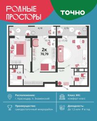 "Родные просторы"- самодостаточный микрорайон, который реализован по принципу комплексного развития территории, где есть вся инфраструктура для комфортной жизни. На территории 41 га 29 домов от 9 до 24 этажей, уютные дворы со спортивными и игровыми площадками, социальные и коммерческие объекты, зеленые массивы и фонтаны. Главная точка притяжения "Родных просторов" - парк семейного отдыха площадью 9 га, 4,5 км прогулочных аллей, амфитеатр для мероприятий, кинофестивальная площадка. Особая гордость микрорайона современная школа на 1550 мест и 3 детских сада "Ладушки", "Веснушки" и "Топотушки" на 880 малышей. В центре микрорайона строятся фитнес-клуб BALANCE с акватермальным комплексом и собственная поликлиника, площадью более 5000 кв.м. Уже открыт православный храм Святых Первоверховных апостолов Петра и Павла.