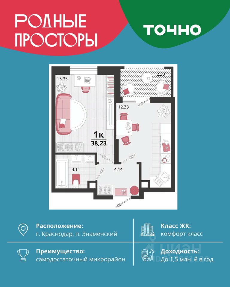 "Родные просторы"- самодостаточный микрорайон, который реализован по принципу комплексного развития территории, где есть вся инфраструктура для комфортной жизни. На территории 41 га 29 домов от 9 до 24 этажей, уютные дворы со спортивными и игровыми площадками, социальные и коммерческие объекты, зеленые массивы и фонтаны. Главная точка притяжения "Родных просторов" - парк семейного отдыха площадью 9 га, 4,5 км прогулочных аллей, амфитеатр для мероприятий, кинофестивальная площадка. Особая гордость микрорайона современная школа на 1550 мест и 3 детских сада "Ладушки", "Веснушки" и "Топотушки" на 880 малышей. В центре микрорайона строятся фитнес-клуб BALANCE с акватермальным комплексом и собственная поликлиника, площадью более 5000 кв.м. Уже открыт православный храм Святых Первоверховных апостолов Петра и Павла.