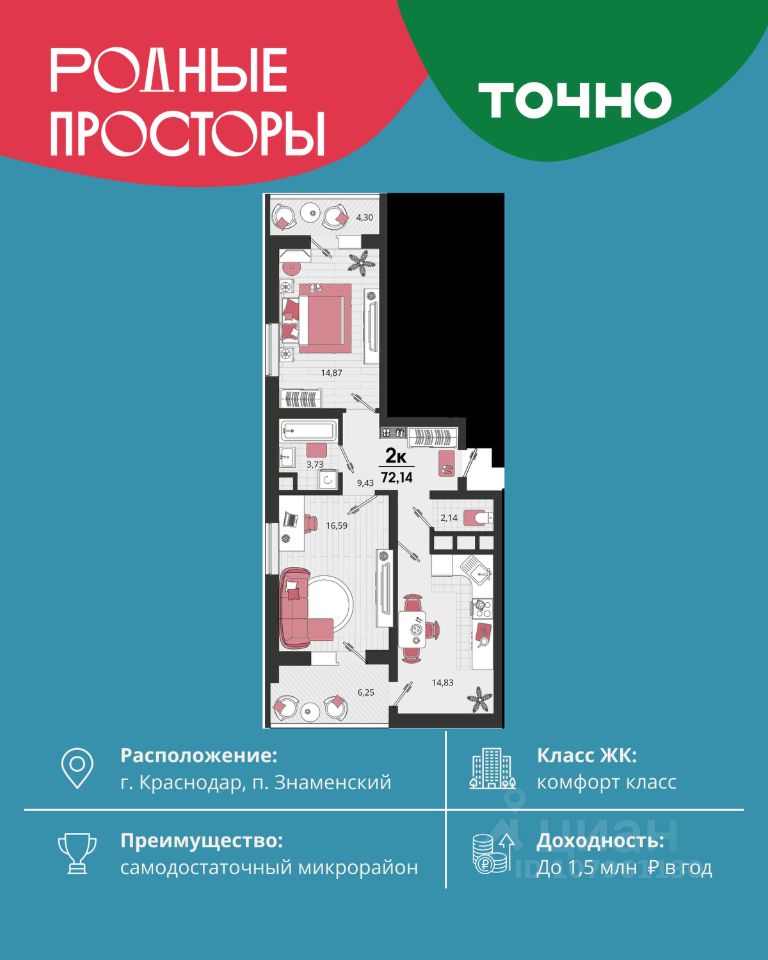 "Родные просторы"- самодостаточный микрорайон, который реализован по принципу комплексного развития территории, где есть вся инфраструктура для комфортной жизни. На территории 41 га 29 домов от 9 до 24 этажей, уютные дворы со спортивными и игровыми площадками, социальные и коммерческие объекты, зеленые массивы и фонтаны. Главная точка притяжения "Родных просторов" - парк семейного отдыха площадью 9 га, 4,5 км прогулочных аллей, амфитеатр для мероприятий, кинофестивальная площадка. Особая гордость микрорайона современная школа на 1550 мест и 3 детских сада "Ладушки", "Веснушки" и "Топотушки" на 880 малышей. В центре микрорайона строятся фитнес-клуб BALANCE с акватермальным комплексом и собственная поликлиника, площадью более 5000 кв.м. Уже открыт православный храм Святых Первоверховных апостолов Петра и Павла.
