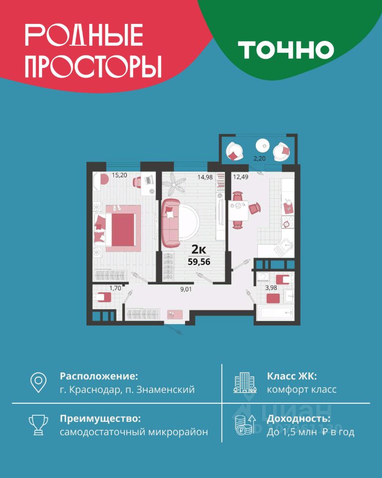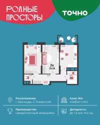 "Родные просторы"- самодостаточный микрорайон, который реализован по принципу комплексного развития территории, где есть вся инфраструктура для комфортной жизни. На территории 41 га 29 домов от 9 до 24 этажей, уютные дворы со спортивными и игровыми площадками, социальные и коммерческие объекты, зеленые массивы и фонтаны. Главная точка притяжения "Родных просторов" - парк семейного отдыха площадью 9 га, 4,5 км прогулочных аллей, амфитеатр для мероприятий, кинофестивальная площадка. Особая гордость микрорайона современная школа на 1550 мест и 3 детских сада "Ладушки", "Веснушки" и "Топотушки" на 880 малышей. В центре микрорайона строятся фитнес-клуб BALANCE с акватермальным комплексом и собственная поликлиника, площадью более 5000 кв.м. Уже открыт православный храм Святых Первоверховных апостолов Петра и Павла.