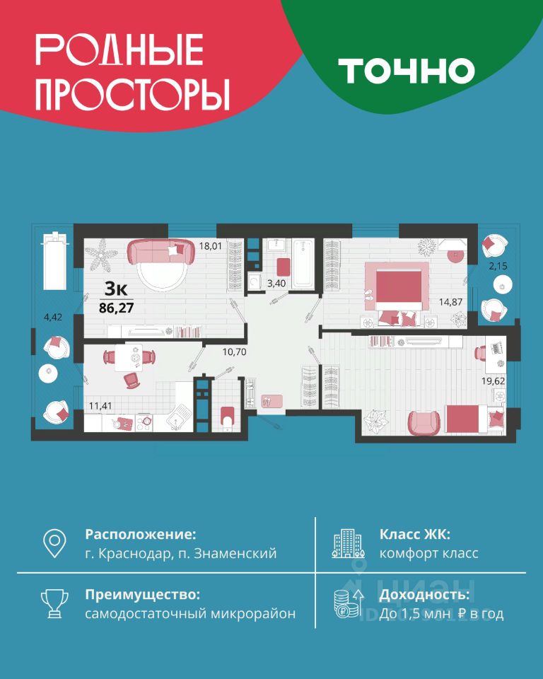 "Родные просторы"- самодостаточный микрорайон, который реализован по принципу комплексного развития территории, где есть вся инфраструктура для комфортной жизни. На территории 41 га 29 домов от 9 до 24 этажей, уютные дворы со спортивными и игровыми площадками, социальные и коммерческие объекты, зеленые массивы и фонтаны. Главная точка притяжения "Родных просторов" - парк семейного отдыха площадью 9 га, 4,5 км прогулочных аллей, амфитеатр для мероприятий, кинофестивальная площадка. Особая гордость микрорайона современная школа на 1550 мест и 3 детских сада "Ладушки", "Веснушки" и "Топотушки" на 880 малышей. В центре микрорайона строятся фитнес-клуб BALANCE с акватермальным комплексом и собственная поликлиника, площадью более 5000 кв.м. Уже открыт православный храм Святых Первоверховных апостолов Петра и Павла.