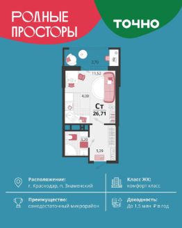 от 9 до 24 этажей, уютные дворы со спортивными и игровыми площадками, социальные и коммерческие объекты, зеленые массивы и фонтаны. Главная точка притяжения "Родных Просторов" — парк семейного отдыха площадью 9 га, 4,5 км прогулочных аллей, амфитеатр для мероприятий, кинофестивальная площадка. Особая гордость микрорайона — современная школа на 1550 мест и 3 детских сада "Ладушки", "Веснушки" и "Топотушки" на 880 малышей. В центре микрорайона строятся фитнес-клуб "Баланс" с акватермальным комплексом и собственная поликлиника площадью более 5000 кв.м. Уже открыт православный храм Святых Первоверховных апостолов Петра и Павла. "Родные Просторы""— проект для жизни или инвестиций с доходом до 1,5 млн. руб. в год.*