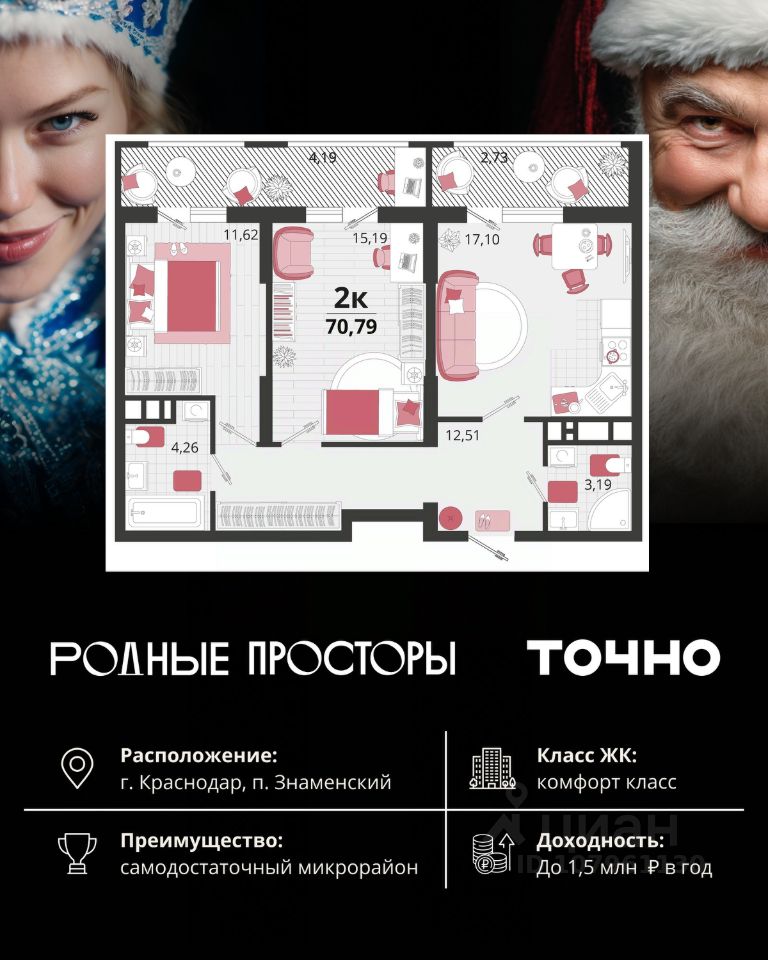 "Родные просторы"- самодостаточный микрорайон, который реализован по принципу комплексного развития территории, где есть вся инфраструктура для комфортной жизни. На территории 41 га 29 домов от 9 до 24 этажей, уютные дворы со спортивными и игровыми площадками, социальные и коммерческие объекты, зеленые массивы и фонтаны. Главная точка притяжения "Родных просторов" - парк семейного отдыха площадью 9 га, 4,5 км прогулочных аллей, амфитеатр для мероприятий, кинофестивальная площадка. Особая гордость микрорайона современная школа на 1550 мест и 3 детских сада "Ладушки", "Веснушки" и "Топотушки" на 880 малышей. В центре микрорайона строятся фитнес-клуб BALANCE с акватермальным комплексом и собственная поликлиника, площадью более 5000 кв.м. Уже открыт православный храм Святых Первоверховных апостолов Петра и Павла.