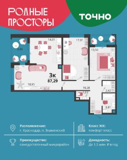 "Родные Просторы" — самодостаточный микрорайон, который реализуется по принципам комплексного развития территории. На территории 41 га возводится один из самых масштабных проектов в Краснодарском крае, который включает: 29 разновысотных домов_x000D_ от 9 до 24 этажей, уютные дворы со спортивными и игровыми площадками, социальные и коммерческие объекты, зеленые массивы и фонтаны. Главная точка притяжения "Родных Просторов" — парк семейного отдыха площадью 9 га, 4,5 км прогулочных аллей, амфитеатр для мероприятий, кинофестивальная площадка. Особая гордость микрорайона — современная школа на 1550 мест и 3 детских сада "Ладушки", "Веснушки" и "Топотушки" на 880 малышей. В центре микрорайона строятся фитнес-клуб "Баланс" с акватермальным комплексом и собственная поликлиника площадью более 5000 кв.м. Уже открыт православный храм Святых Первоверховных апостолов Петра и Павла. "Родные Просторы""— проект для жизни или инвестиций с доходом до 1,5 млн. руб. в год.*